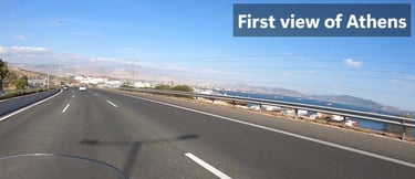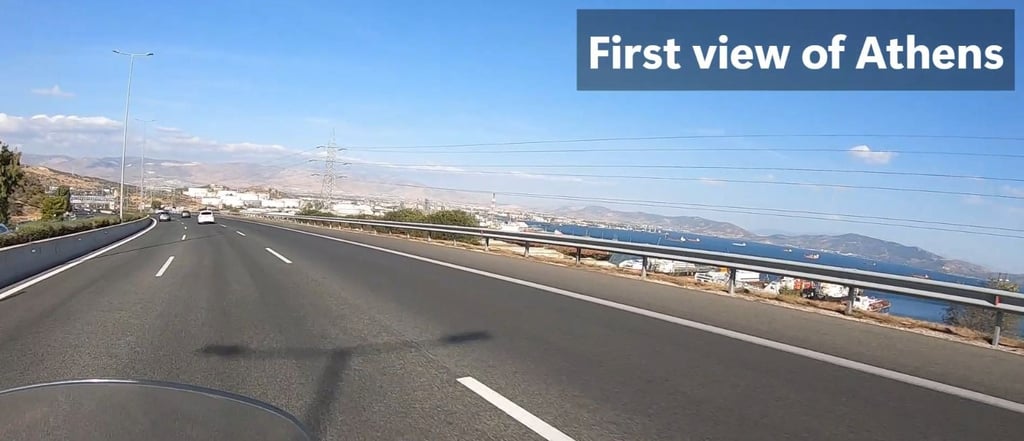 It took us about four hours to reach Athens, including stops. We arrived on Friday late afternoon during rush hour when people were leaving work. Our apartment was in Piraeus, and we needed to drive about 45 minutes through city traffic to get there. Google Maps directed us to less busy roads and streets. Traffic in Athens is very dynamic, with scooters and motorcycles rushing and weaving through traffic, so you really need to pay attention when changing lanes. People on scooters don't use any protective gear except for helmets; some don't even wear those.