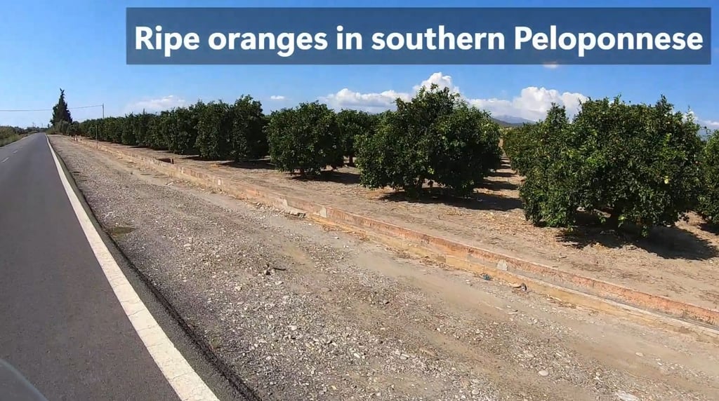 We considered staying another day in Monemvasia to enjoy more of its beauty, but the windy morning made our decision easier. It was time to move on to our next stop, the Greek capital. We first drove back toward Gytheio, where we had come from. We enjoyed the view of ripe oranges, and after trying some local oranges earlier in Koroni, we wouldn't have minded trying these as well.