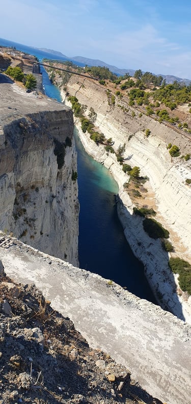 Completed in 1893, it separates the Peloponnese peninsula from the Greek mainland. The canal is 6.4 kilometers long and 25 meters wide. It is currently of little economic importance because modern ships cannot pass through it and is mainly a tourist attraction. To see it, we did some off-roading to reach about the middle of the canal.