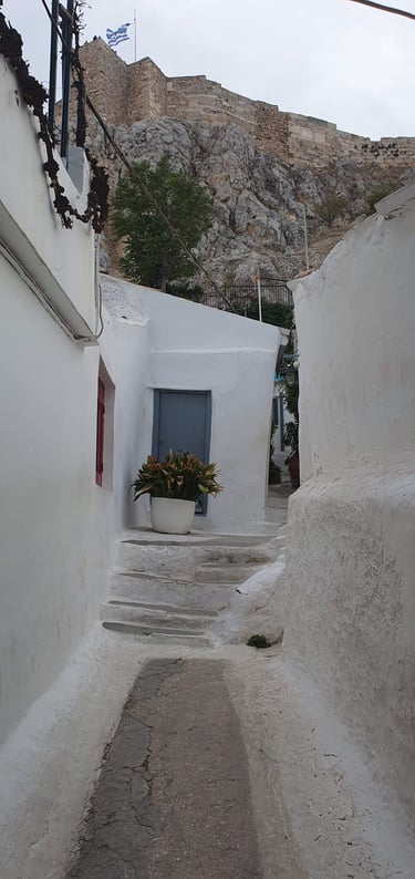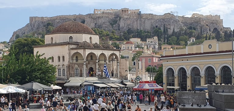 First, we needed to figure out how to get to Athens from Piraeus, where we had the apartment. We were close to the train station, so we took the train for three stops, then the metro for another five stops, and arrived right in front of the Acropolis hill. A daily pass for all public transportation costs €4.10. The combination of train and metro is the fastest way to commute in the city because it is not affected by traffic.