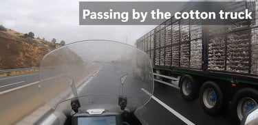 After about an hour, it started to drizzle, so we stopped at a gas station, refueled, and put on our rain gear.